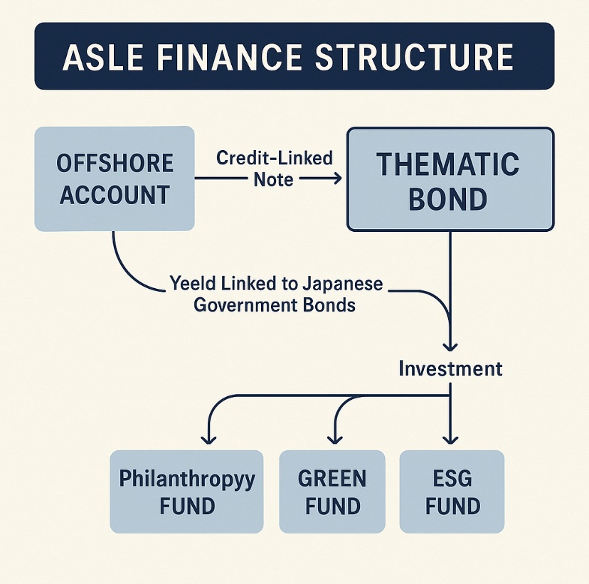 Untuk memperkuat kepercayaan investor, ASLE bond ditautkan dengan struktur collateralized credit-linked note (CLN), sebagai berikut: Offshore account (di jurisdiction transparan dan tax compliant, seperti Singapore atau Luxembourg) akan menyimpan cadangan dana dari grantor (philanthropic pool atau diaspora fund). CLN diterbitkan dengan struktur: Off balance sheet treatment. Linked to Japanese Government Bonds (JGB) sebagai yield benchmark. Credit event trigger: digunakan hanya jika revenue ASLE default pada covenant tertentu. Fungsi: Sebagai sumber pembayaran terakhir (waterfall support) bila terjadi underperformance cash flow.