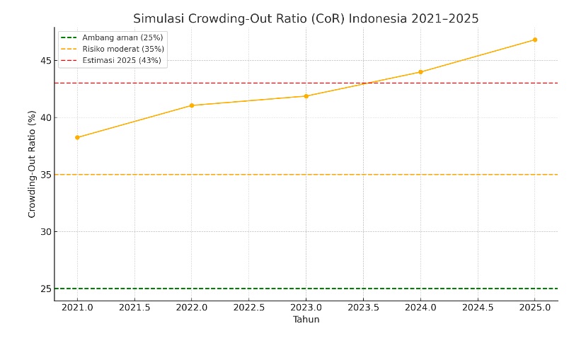 Dalam konteks ini, terjadi fenomena crowding-out yang serius. Estimasi indikatif menunjukkan bahwa Crowding-Out Ratio (CoR) Indonesia saat ini dapat berada pada kisaran ±43%, jika merujuk pada proporsi dominasi pembiayaan publik atas likuiditas domestik melalui instrumen SBN dan SRBI dibandingkan dengan penyaluran kredit produktif sektor swasta.