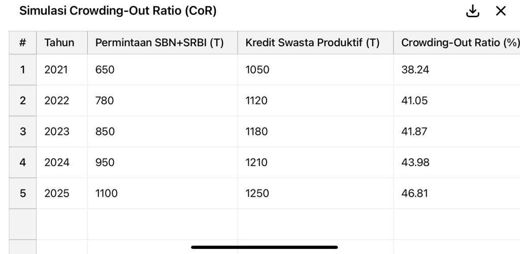 Berikut adalah tabel dan grafik simulasi Crowding-Out Ratio (CoR) Indonesia tahun 2021–2025 berdasarkan estimasi proporsi likuiditas yang diserap oleh SBN dan SRBI dibandingkan kredit swasta produktif.