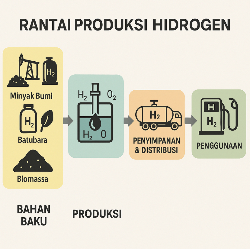 Ada empat jalur produksi utama: Steam Reforming. Memecah metana dari gas alam dengan uap. Gasifikasi. Batubara/biomassa diubah menjadi synthesis gas, lalu hidrogen dipisahkan. Elektrolisis. Air dipisah menjadi hidrogen & oksigen lewat aliran listrik. Biologis. Mikroba atau alga memproduksi hidrogen lewat reaksi biologis.