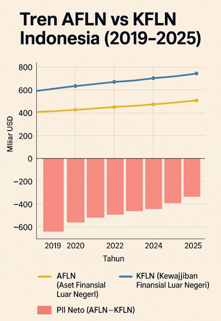 Problem yang lebih dalam terletak pada struktur eksternal Indonesia sendiri. Bank Indonesia melaporkan, pada akhir kuartal I 2025, Aset Finansial Luar Negeri (AFLN): USD 533,1 miliar, meliputi cadangan devisa, investasi swasta, dan aset luar negeri BUMN. Sementara Kewajiban Finansial Luar Negeri (KFLN): USD 757,6 miliar, terdiri dari investasi langsung, portofolio, derivatif, dan pinjaman lainnya. Selisihnya kewajiban neto sebesar USD 224,5 miliar. Itu mencerminkan kenyataan getir: kurs rupiah berdiri di atas pondasi modal asing. Artinya, kestabilan nilai tukar bukan hasil surplus tabungan valas domestik, melainkan hasil kepercayaan asing untuk terus menanamkan modalnya. Apa jadinya bila asing distrust? Rupiah terjun bebas. Chaos ekonomi dan politik tidak bisa dihindari. Maka yang terjadi, terjadilah.