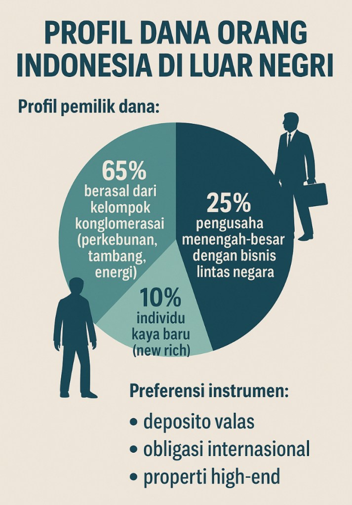 Karena motive mereka menempatkan uang diluar negeri memang escape. Umumnya mereka punya dua passport dan second home di luar negeri. Uang mereka sudah berubah jadi asset portofolio global. Sehingga aman dari kejaran hukum dan moral kalau terjadi chaos politik dalam negeri. Kemarin waktu aksi demo Agustus 2025, kita bisa lihat. Rumah Anggota DPR dan Menteri pun dijarah. Sebelum nya tahun 1998 juga kita sama sama tahu. Bau amis darah dan airmata.