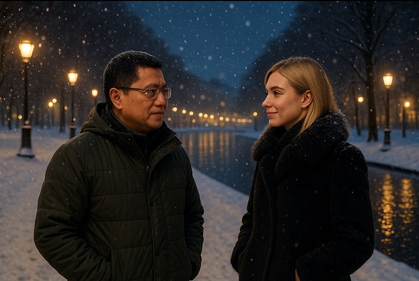 Aku mengenakan jaket musin dingin dan tentu underwear thermal, sedikit kikuk karena hawa menusuk tulang. Natalya datang dengan langkah anggun, tubuhnya tegak seperti seorang balerina, dan senyum yang hangat. “Kali pertama saya bayangkan Anda lebih besar, lebih menyeramkan,” katanya sambil tertawa pelan. “Nyatanya hanya pria bersahaja, dengan setelan Armani yang sedikit berlebihan.”