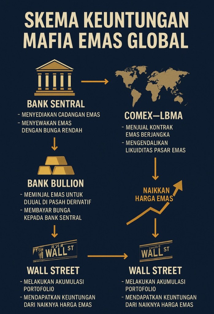 Harga emas dunia tidak merefleksikan permintaan dan penawaran fisik yang wajar. Harga justru banyak dikendalikan oleh instrumen keuangan derivatif dan rekayasa pasokan buatan oleh kelompok pemain besar (bullion banks, ETF managers, dan bank sentral Barat). Berikut mekanismenya: