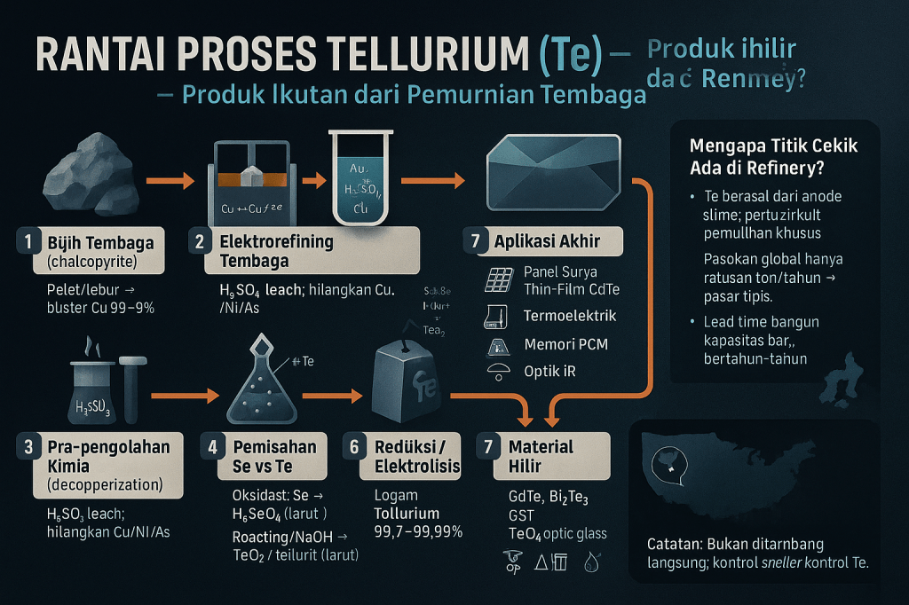 Tellurium bukan ditambang khusus. Ia sebagian besar muncul sebagai produk ikutan dari lumpur anoda pada pemurnian tembaga elektrolitik. Artinya, siapa yang menguasai smelter–refinery tembaga dan sirkuit pemulihan lumpur anodanya, dia menguasai pasokan Te. Ini persis area yang dibesarkan Tiongkok selama satu dekade terakhir.