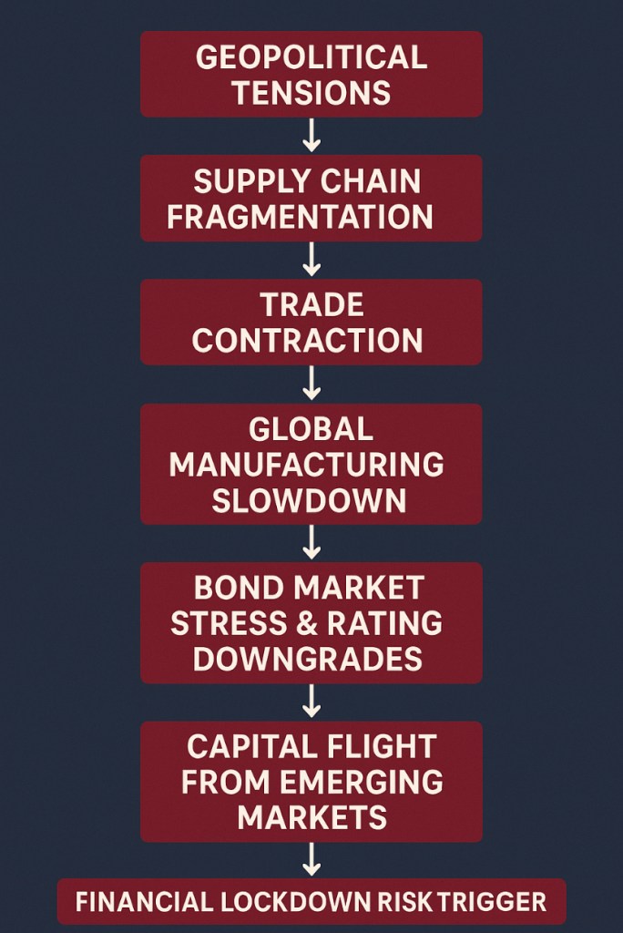 Gelombang risiko tidak datang dari satu arah. Kombinasi perang tarif AS–China, kontrol ekspor mineral, serta tekanan utang global menciptakan fragmentasi rantai nilai. Dari situ lahir efek berantai: penurunan ekspor, deflasi aset, hingga pembekuan kredit lintas batas.