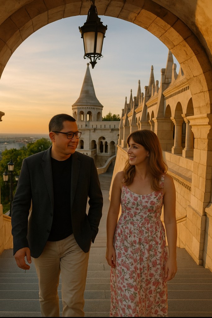 Ketika saya keluar bandara Ferenc Liszt, matahari sore memantulkan cahaya emas ke kaca gedung terminal. Angin lembut membawa aroma debu, bensin, dan roti panggang dari kafe dekat pintu keluar. Di sanalah Karel menunggu saya. Ia berdiri bersandar pada Audi hitam dengan kaca gelap—mobil pinjaman. Karel tidak seperti perempuan Eropa yang biasa bekerja di dunia finansial. Ada kekuatan tenang pada dirinya. Wajahnya tegas: dagu rapi, mata hijau gelap yang selalu tampak menganalisis sesuatu di balik orang yang ia lihat. Tubuhnya ramping, tapi dengan energi orang yang terbiasa bekerja 14 jam sehari.