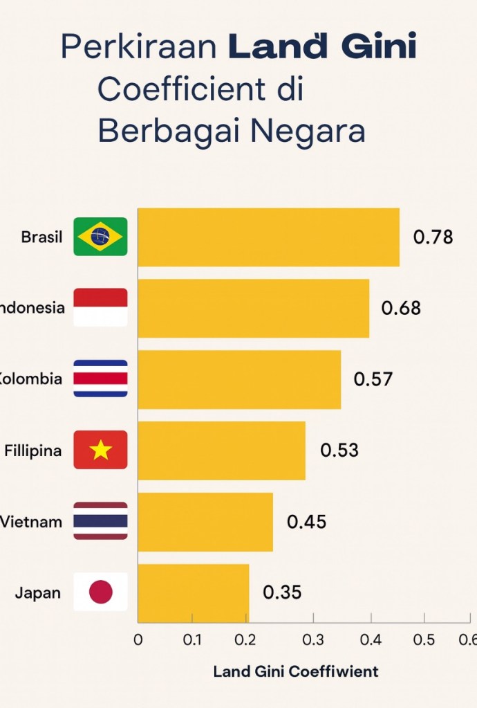 Berbagai studi akademik, antara lain oleh Ward Anseeuw (Land Matrix), Heryanto & Murray (2016), serta kajian KPA. Menempatkan Gini Lahan Indonesia pada kisaran 0,64–0,72, salah satu yang tertinggi di dunia. Untuk konteks, perbandingan Land Gini beberapa negara.