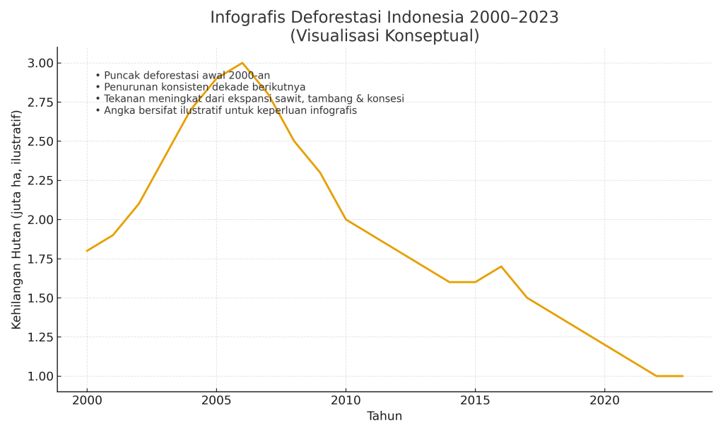 Narasi resmi sering menyatakan bahwa penurunan angka deforestasi adalah bukti bahwa Indonesia sedang berada di jalur kebijakan lingkungan yang benar. Grafik tahunan yang tampak menurun dianggap sebagai keberhasilan moratorium, pengawasan, dan pendekatan kehutanan modern. Namun ketika ditelusuri secara lebih akademis, penurunan angka deforestasi tidak selalu berarti perbaikan struktural, melainkan sering mencerminkan dinamika siklus komoditas, saturasi ekspansi lahan, dan perubahan peluang ekonomi, bukan perubahan paradigma ekologis.