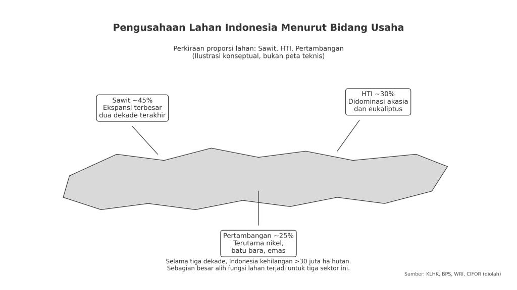Indonesia kerap dipromosikan sebagai negeri kaya sumber daya: hutan tropis terluas ketiga dunia, cadangan mineral strategis, dan lahan produktif yang membentang dari Sabang sampai Merauke. Namun di balik narasi optimisme itu, terselip empat masalah struktural yang terus membayangi, yaitu ketimpangan penguasaan lahan, deforestasi sistemik, kontribusi SDA yang minim terhadap kemakmuran, dan praktik state capture dalam pemberian konsesi dan izin tambang. Keempat persoalan ini saling mengikat, membentuk lingkaran setan yang menahan ekonomi Indonesia dari lompatan struktural yang seharusnya sudah terjadi.