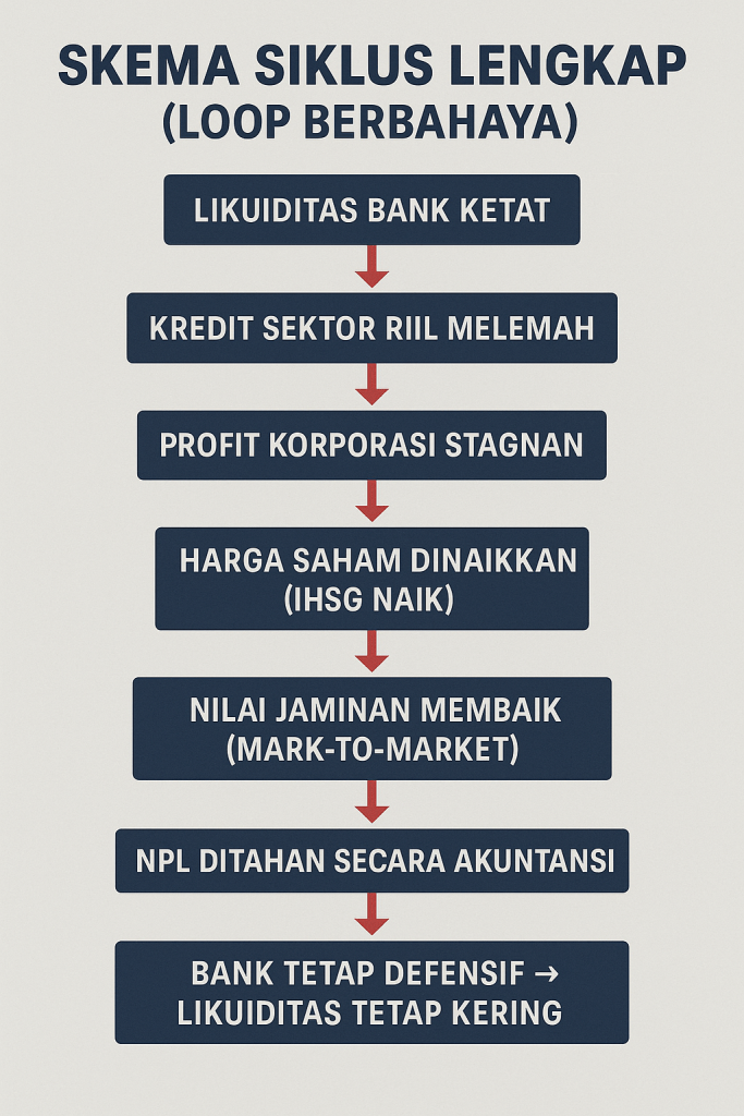 Ia menampilkan diagram sederhana. Likuiditas ketat, kredit riil melambat, laba stagnan, valuasi aset dinaikkan, NPL tertahan.